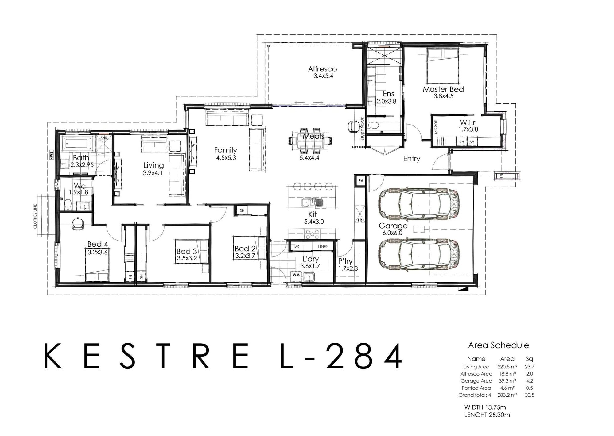 Light filled, functional, passively designed & energy efficient, the Kestrel has all this and more in an inviting cost-effective package. Featuring our standard Alatalo inclusions throughout in a bright open plan home with four bedrooms, 2 separate living areas, versatile study nook, 2 bathrooms and a double garage with practical internal access close to the kitchen/pantry. The kitchen is spacious enough for the whole family and the functional design layout is a must for a keen cook with plenty of bench space and storage, all electric appliances and a walk-in pantry. Sliding doors from the open plan dining-living zone lead to the covered alfresco area for year-round entertaining. The master bedroom is well appointed with WIR and ensuite, separate to the further 3 bedrooms located at the rear of the home.